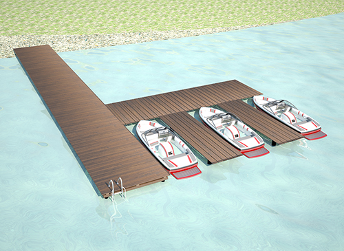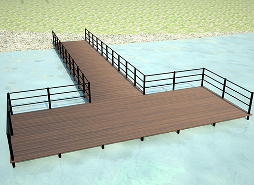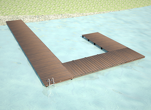 «L»-образный пирс, классический пирс для рек с течением, т.к. форма пирса как латинская буква «L» создает жесткость во всей конструкции, что в свою очередь предотвращает поломку пирса при ледоходе. Такие пирсы можно устраивать как на мелководье, так и при больших глубинах. На пирсе возможно устроить навес, освещение, место для рыбалки, швартовки катеров, лодок.